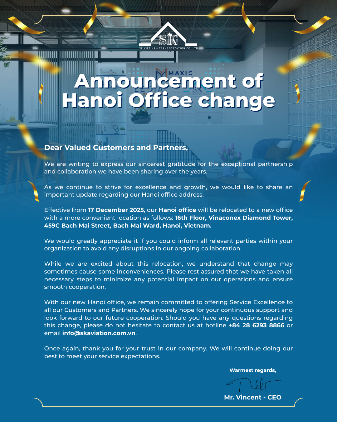 Việc thay đổi địa điểm đã được SK Aviation chuẩn bị kỹ lưỡng nhằm đảm bảo mọi hoạt động diễn ra liên tục, ổn định và không ảnh hưởng đến chất lượng dịch vụ dành cho Quý Khách hàng và Quý Đối tác.